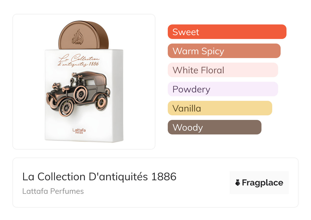 La Collection D'antiquités 1886, from Lattafa Perfumes was released in 2023. The perfumer behind this creation is unknown. It has the top notes of Bergamot and Mate, middle notes of Bark, Cinnamon, Jasmine, Orris Root, and Tonka Bean, and base notes of Musk, Patchouli, Vanilla, White Chocolate, and White Tobacco.