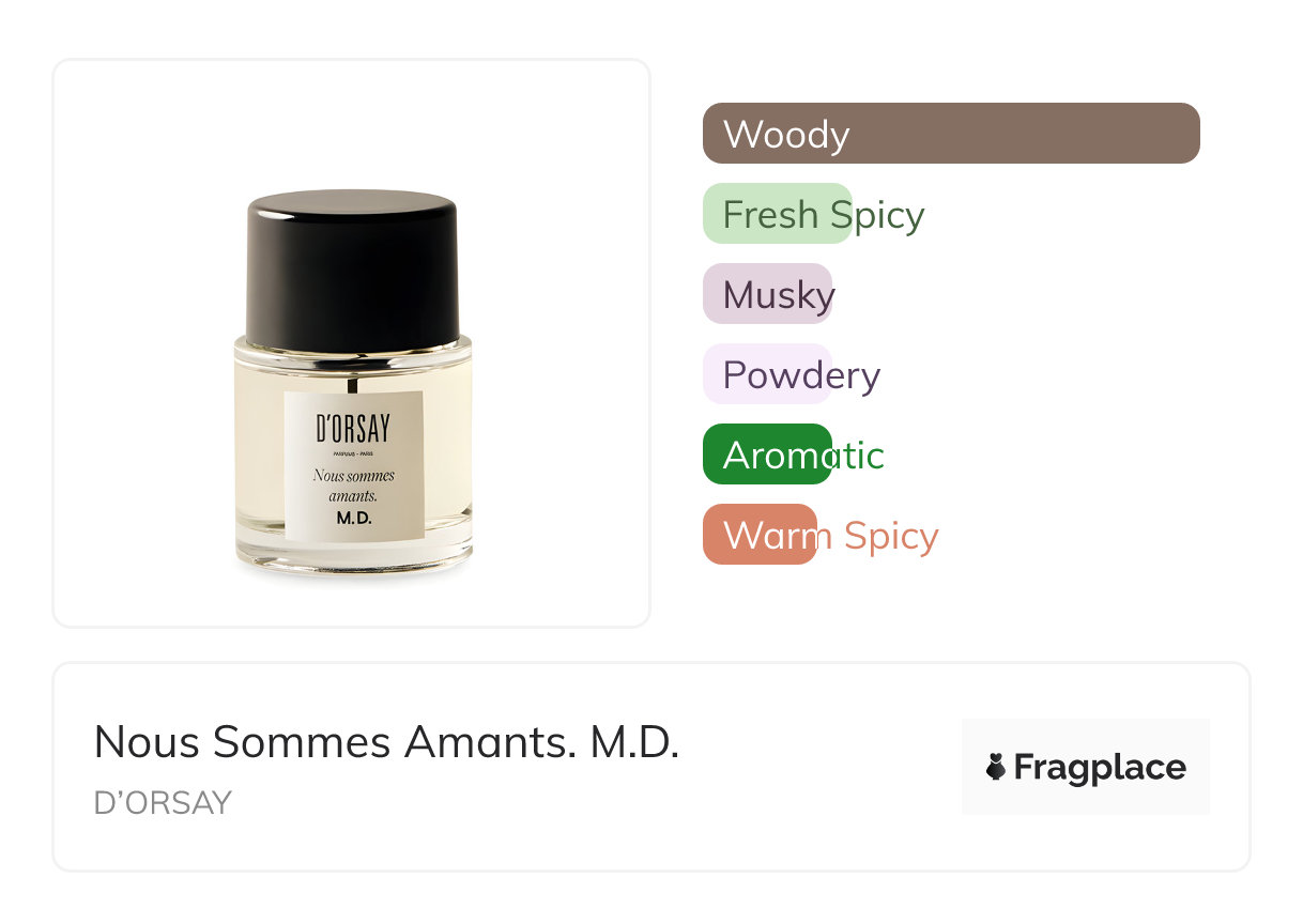 Nous Sommes Amants. M.D., from D’ORSAY was released in 2022. The perfumer behind this creation is Bertrand Duchaufour. It has the top notes of Bamboo, Juniper Berries, Pepper, and Pink Pepper, middle notes of Palo Santo, and base notes of Ambergris, Cedarwood, Cypriol Oil or Nagarmotha, Leather, Musk, and Sandalwood.