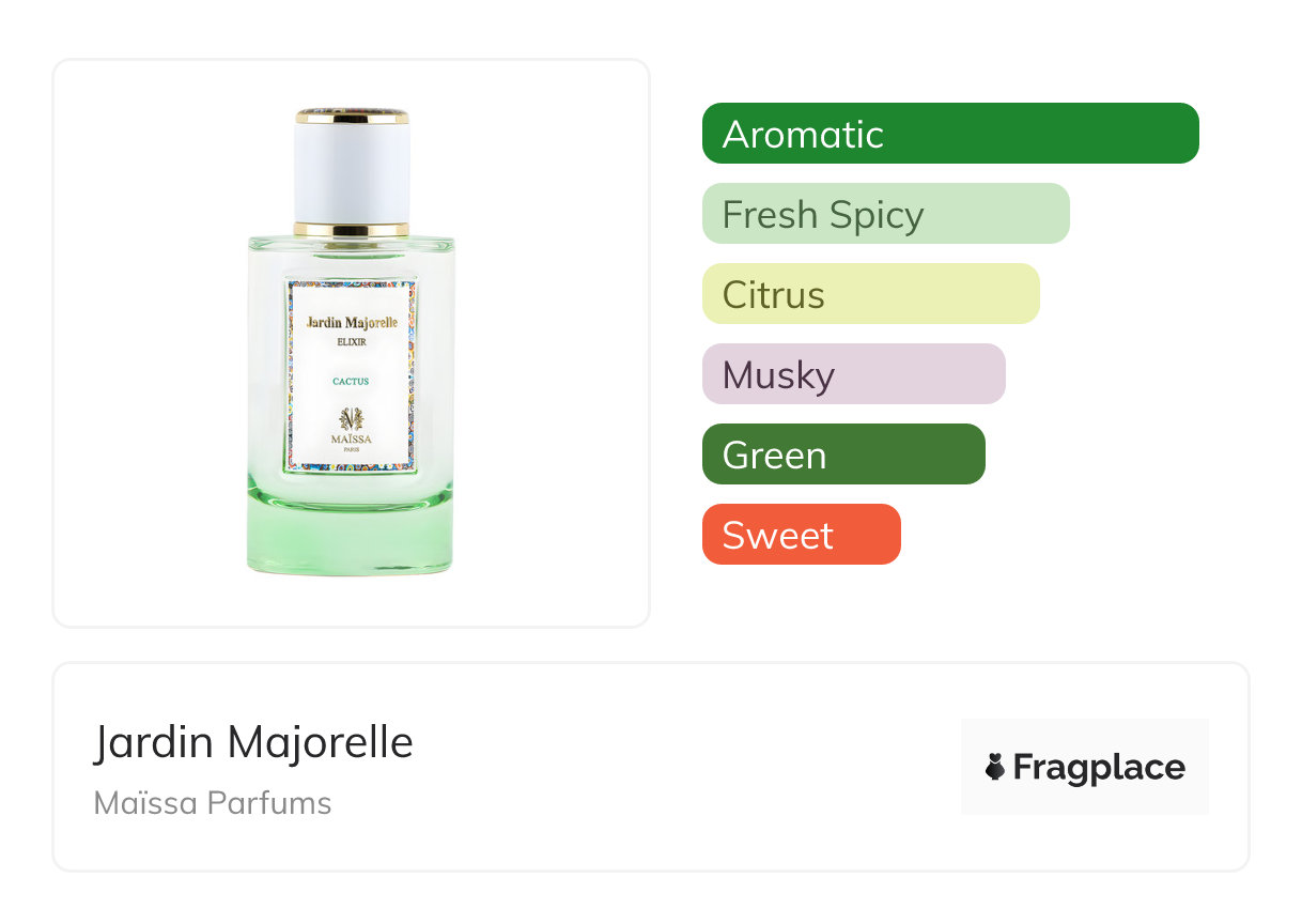 Jardin Majorelle, from Maïssa Parfums was released in 2022. The perfumer behind this creation is unknown. It has the top notes of Bergamot, Fruity Notes, Mint, and Orange, middle notes of Cactus, Mate, and Sea Water, and base notes of Ambroxan and Musk.