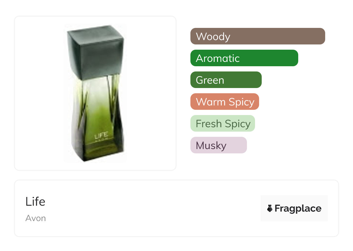 Life, from Avon was released in 2007. The perfumer behind this creation is Ilias Ermenidis. It has the top notes of Basil, Clary Sage, Mountain Air, and Yuzu, middle notes of Cardamom, Driftwood, Green Pepper, and Lavender, and base notes of Amberwood, Cashmere wood, Cedarwood, Musk, and Patchouli.