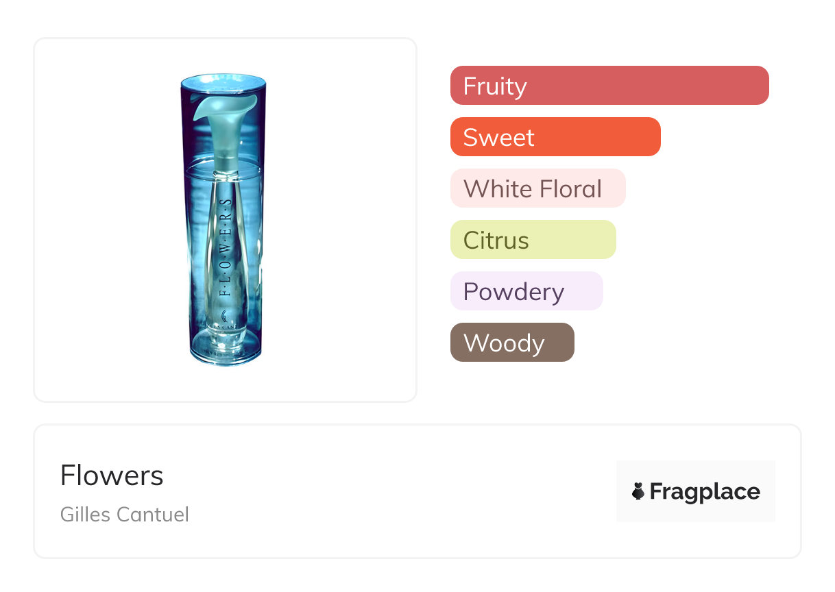 Flowers, from Gilles Cantuel was released in 2000. The perfumer behind this creation is unknown. It has the top notes of Bergamot, Black Currant, Ivy, Orange, and Pear, middle notes of Jasmine, Lily, Peach, and Plum, and base notes of Amber, Iris, Musk, and Oakmoss.