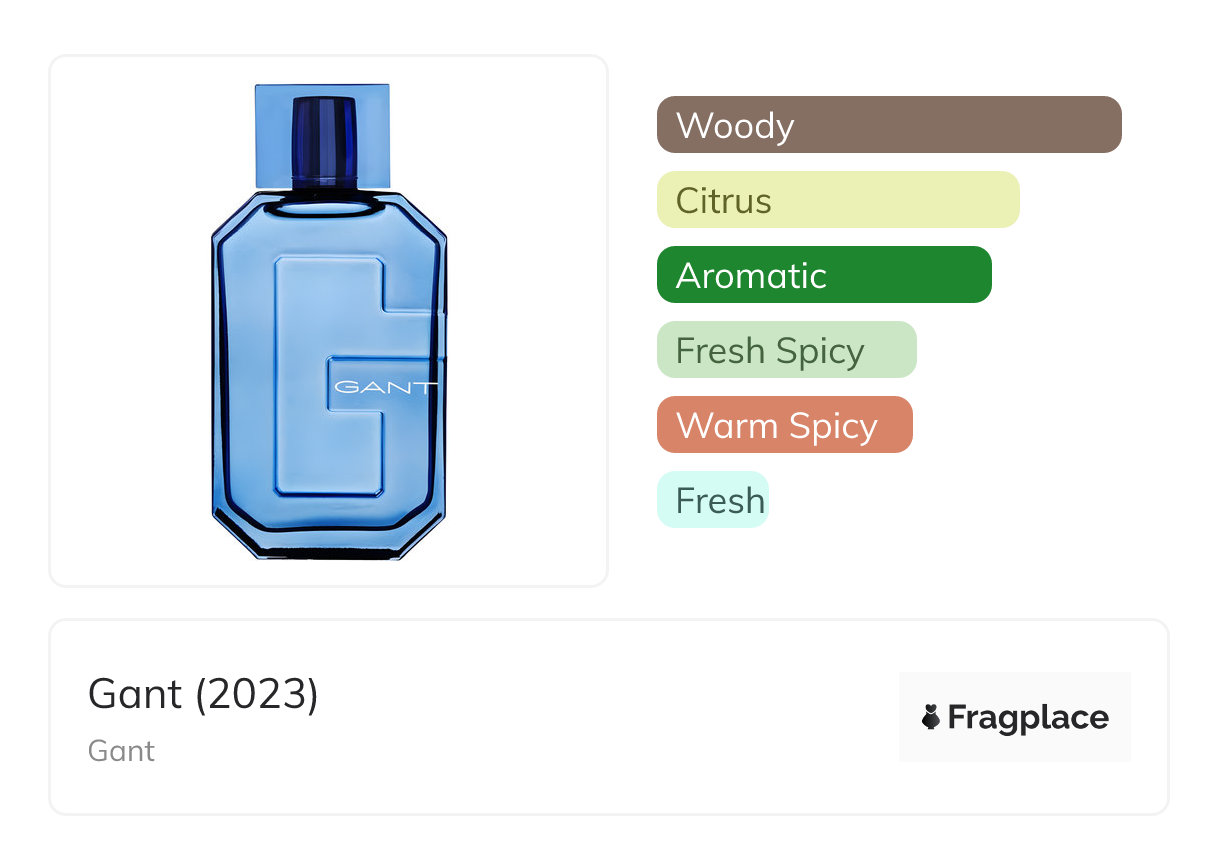 Gant (2023), from Gant was released in 2023. The perfumer behind this creation is Nicolas Beaulieu. It has the top notes of Bergamot, Curcuma (Turmeric), Lemon, and Mandarin Orange, middle notes of Cedarwood, Ivy, Rosemary, and Wormwood, and base notes of Ambertonic™ (IFF), Patchouli, Sandalwood, and Sinfonide.