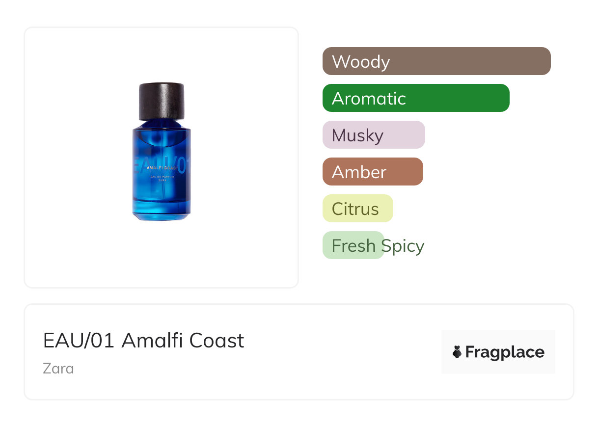 EAU/01 Amalfi Coast, from Zara was released in 2023. The perfumer behind this creation is unknown. It has the top notes of Lemon and Nutmeg, middle notes of Mastic or Lentisque, Thuja, and Woody Notes, and base notes of Ambroxan, Cashmeran, and Vetiver.