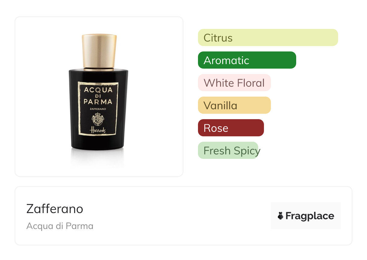 Zafferano, from Acqua di Parma was released in 2022. The perfumer behind this creation is unknown. It has the top notes of Bergamot, Bitter Orange, Coriander, and Mandarin Orange, middle notes of Geranium, Jasmine, Orange Blossom, Rose, and Saffron, and base notes of Tonka Bean, Vanilla, and Woody Notes.