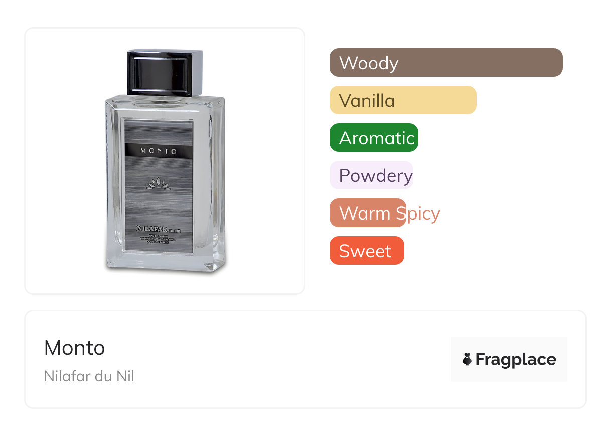 Monto, from Nilafar du Nil was released in 2020. The perfumer behind this creation is unknown. It has the top notes of Agarwood (Oud), Cinnamon, Palisander Rosewood, and Vanilla, middle notes of Elemi, Jasmine, and Vanilla, and base notes of Cedarwood, Ebony Tree, Guaiac Wood, Vanilla, and Vetiver.
