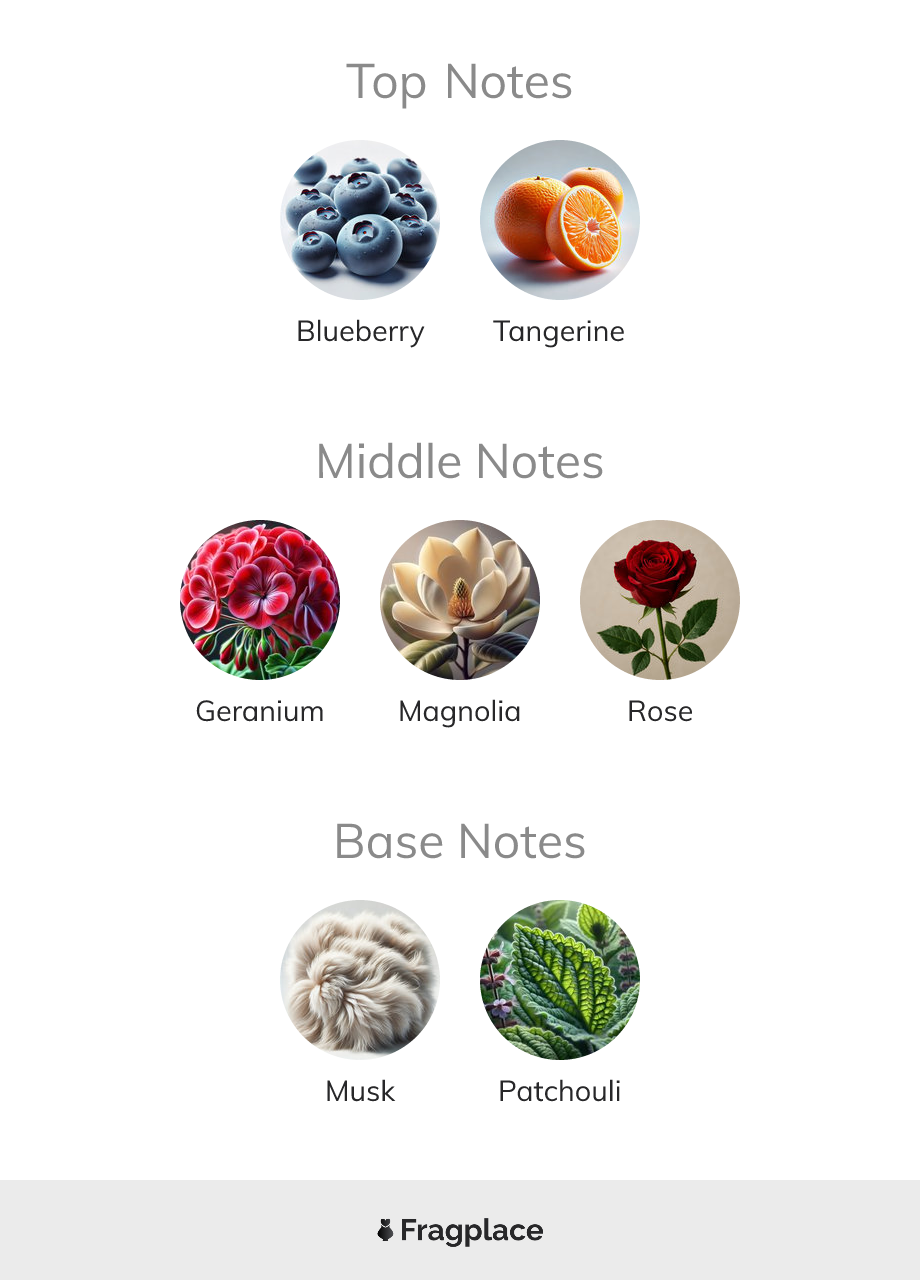 tart blueberries, lots of musk , rose and patchouli . Patchouli goes between being medicinal in the beginning but then becomes chocolate with some spice . A huge like for me