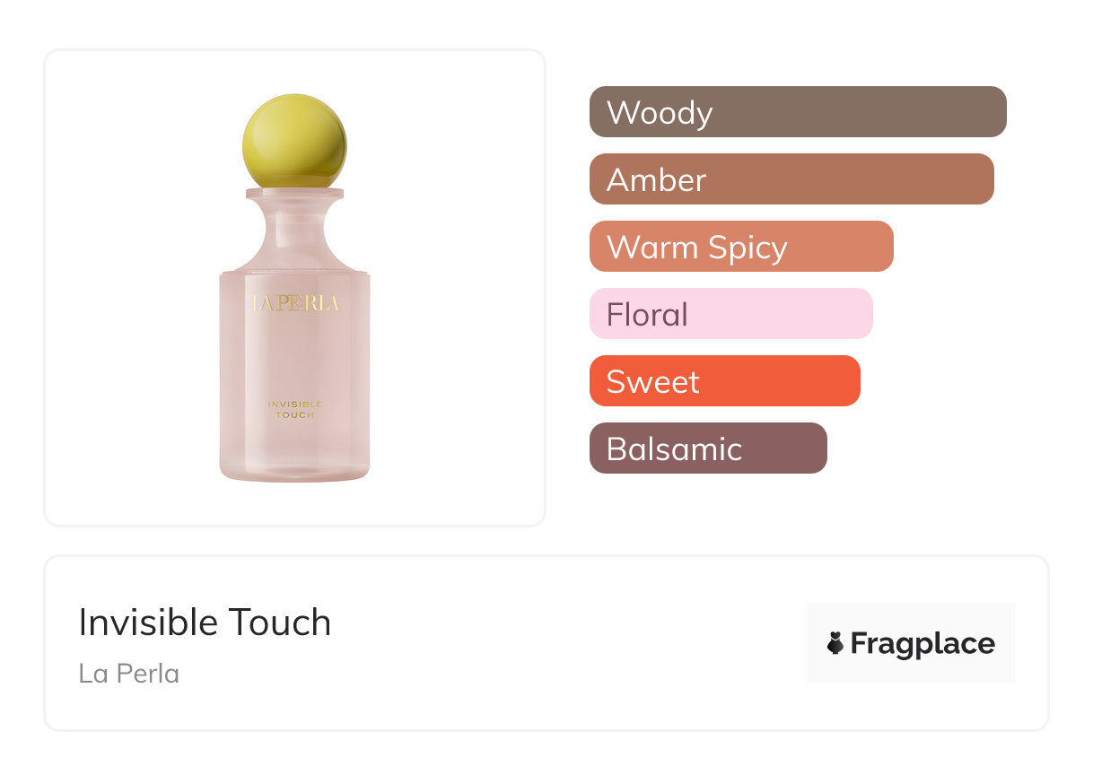 Invisible Touch, from La Perla was released in 2021. The perfumer behind this creation is Dora Baghriche and Nicolas Bonneville. It has the top notes of Aldehydes, Bergamot, and Pink Pepper, middle notes of Paradisone, Rose, Violet, and Ylang-Ylang, and base notes of Ambroxan, Benzoin, Palisander Rosewood, and Patchouli.