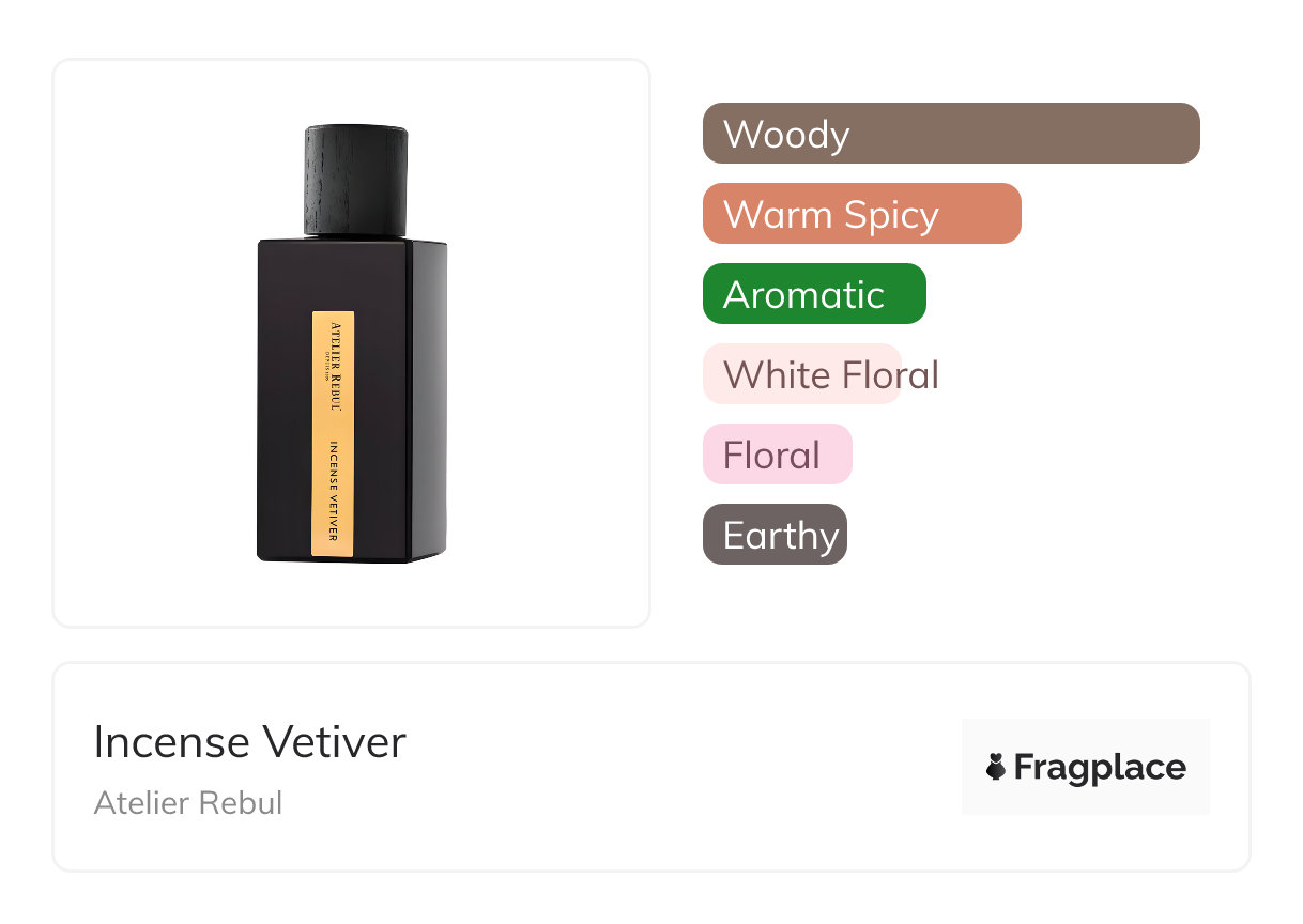 Incense Vetiver, from Atelier Rebul was released at unknown year. The perfumer behind this creation is unknown. It has the top notes of Cedarwood and Cypress, middle notes of Carnation, Jasmine, Lily, Rose, and Vetiver, and base notes of Cedarwood, Immortelle, Incense, Patchouli, and Teak Wood.
