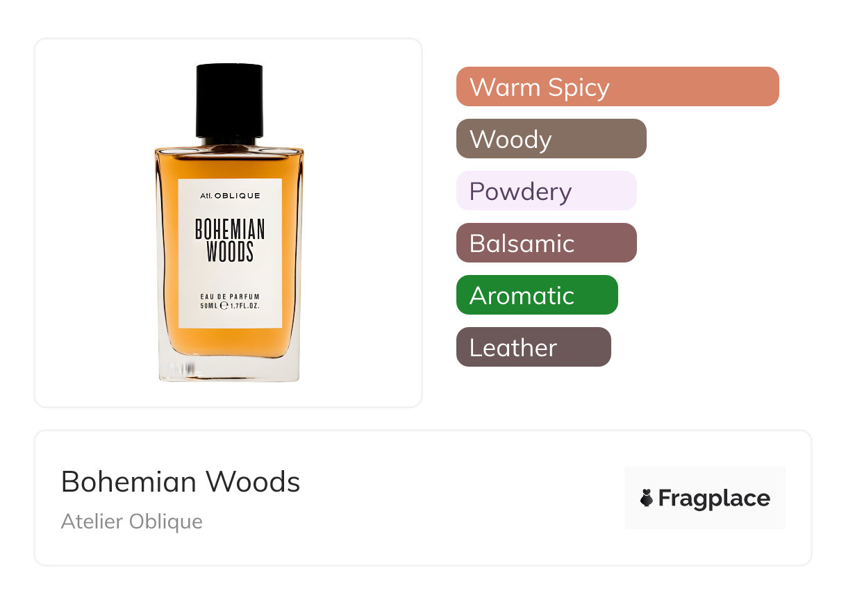 Bohemian Woods, from Atelier Oblique was released in 2018. The perfumer behind this creation is Mathieu Nardin. It has the top notes of Absinthe, Elemi, Freesia, and Pimento, middle notes of Incense, Iris, Patchouli, and Saffron, and base notes of Leather, Musk, Vanilla, and Woody Notes.