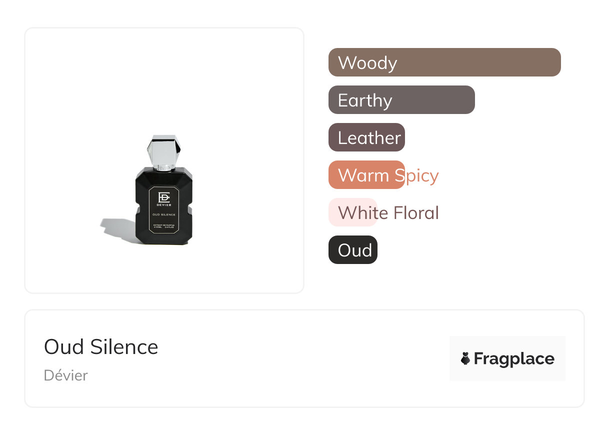 Oud Silence, from Dévier was released at unknown year. The perfumer behind this creation is unknown. It has the top notes of Cypriol Oil or Nagarmotha, Gurjun Balsam, Mandarin Orange, and Violet, middle notes of Cedarwood, Leather, Patchouli, and Saffron, and base notes of Agarwood (Oud), Jasmine, Oakmoss, and Vetiver.