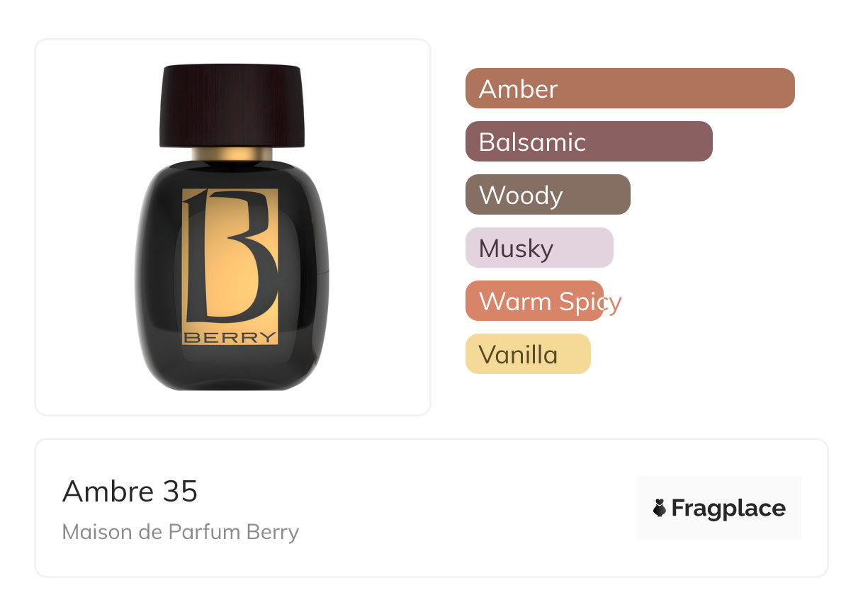 Ambre 35, from Maison de Parfum Berry was released in 2017. The perfumer behind this creation is Anatole Lebreton. It has the top notes of Opoponax and Peru Balsam, middle notes of Patchouli and Rose, and base notes of Benzoin, Labdanum, Musk, and Vanilla.