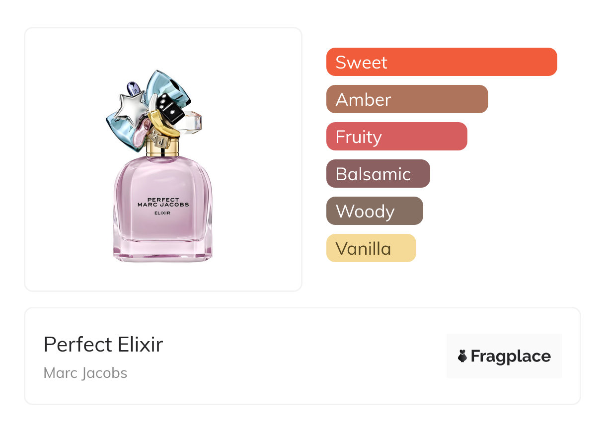 Perfect Elixir, from Marc Jacobs was released in 2024. The perfumer behind this creation is Domitille Michalon Bertier. It has the top notes of Honey, Plum, and Rhubarb, middle notes of Amber and Orange Blossom, and base notes of Patchouli, Resins, and Vanilla.