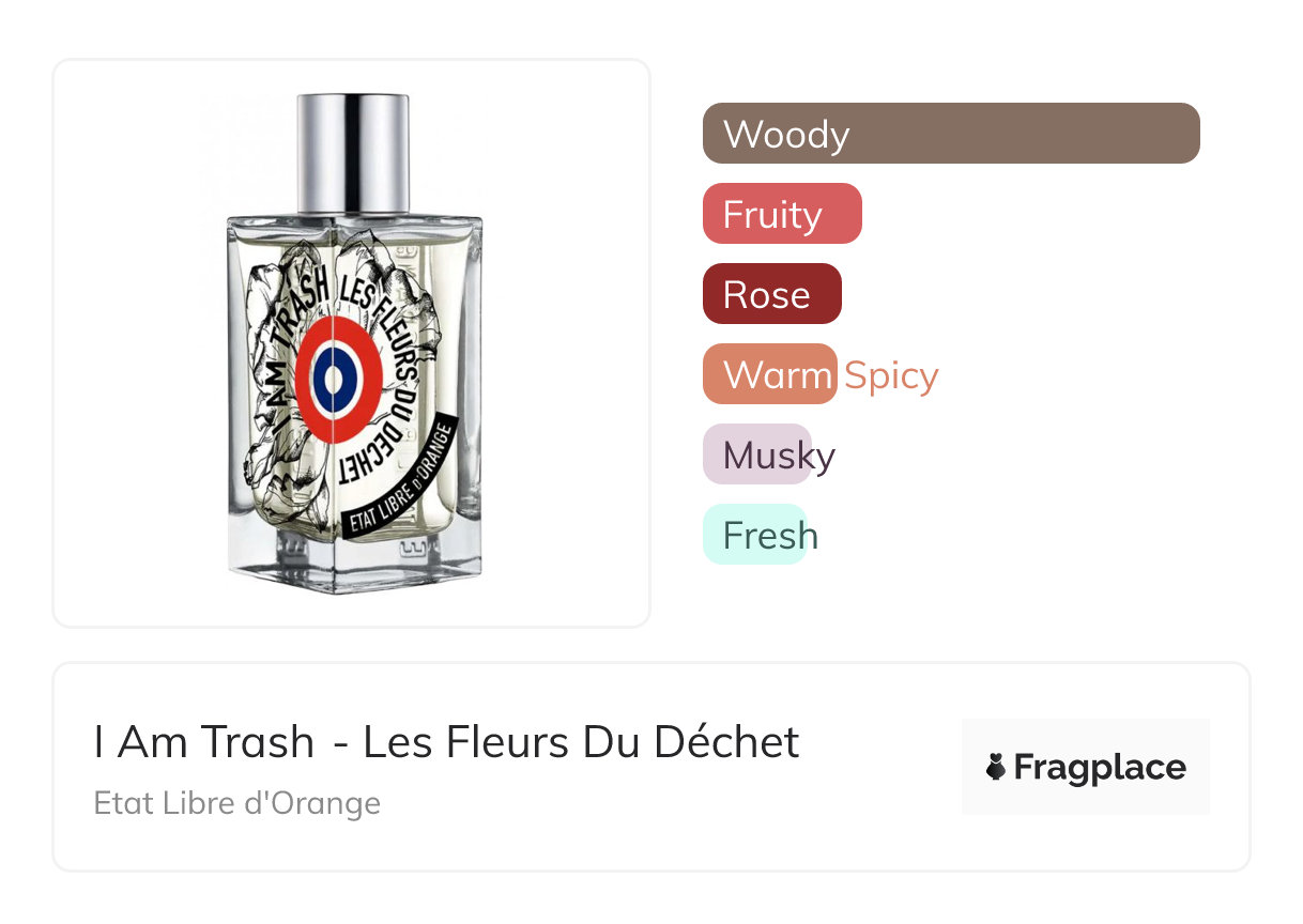 overall “i am trash“ is a very nice skin scent, the opening of beautifull ripe apple with rose is perfectly balanced and very neutral unisex. The dry down comes very fast and gives a woody base with slight hints of that opening. The scène of flowers going past their best is good, without being ”trashy” or “stinky”. it’s a an overal beauty of a fragrance but sadly it could have been stronger of slightly more potent. Its longevity is good, but it becomes a very close skin scent really fast, which i’m personally not a fan. It doesn’t need to be a bomb, but a bit of sillage or projection should be possible.