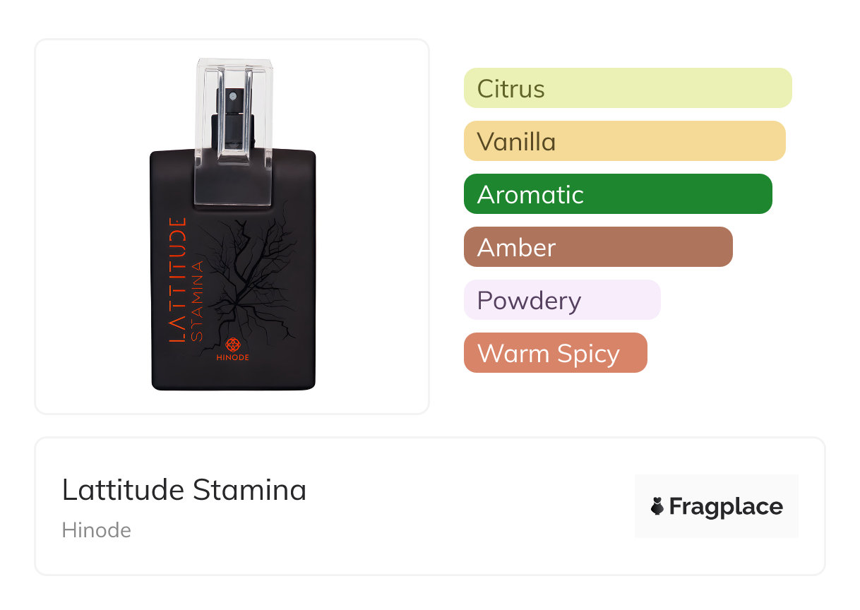 Lattitude Stamina, from Hinode was released in 2019. The perfumer behind this creation is unknown. It has the top notes of Bergamot and Mandarin Orange, middle notes of Cinnamon, Jasmine, Rose, and Vetiver, and base notes of Amber, Musk, Tonka Bean, and Vanilla.