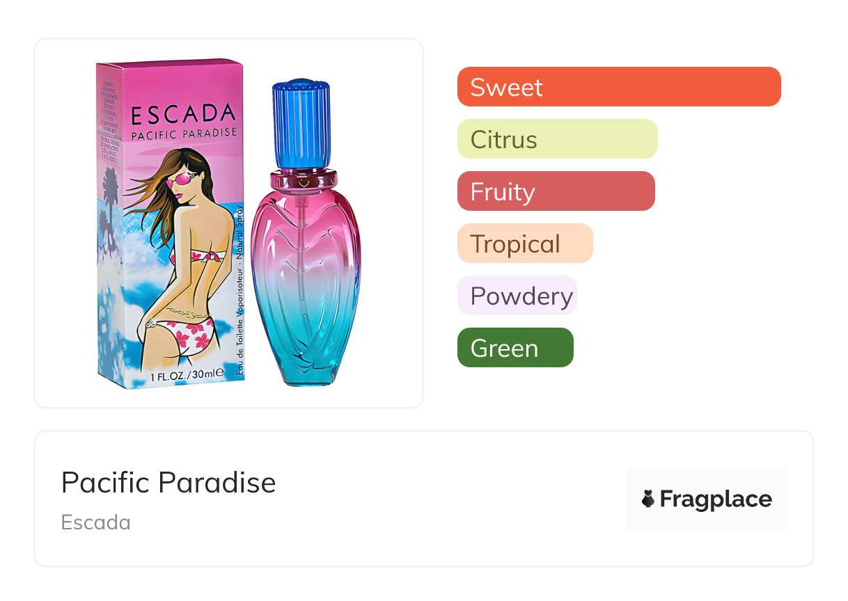 Pacific Paradise, from Escada was released in 2006. The perfumer behind this creation is Philippe Romano. It has the top notes of Apple, Banana, Coconut, Lemon, and Lime, middle notes of Banana, Sugar, and Sunflower, and base notes of Amber, Musk, and Sandalwood.
