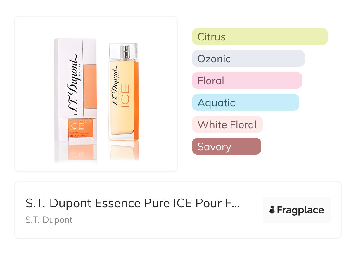 S.T. Dupont Essence Pure ICE Pour Femme, from S.T. Dupont was released in 2010. The perfumer behind this creation is Anne Flipo. It has the top notes of Bergamot, Mandarin Orange, and Watermelon, middle notes of Jasmine, Lotus, and Rose, and base notes of Amber, Patchouli, and Rice.