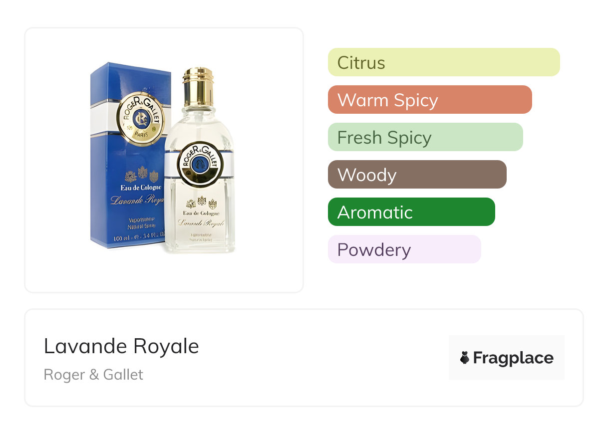 Lavande Royale, from Roger & Gallet was released in 1899. The perfumer behind this creation is unknown. It has the top notes of Mandarin Orange and Orange, middle notes of Geranium, Lavender, and Spicy Notes, and base notes of Benzoin, Cedarwood, Musk, Oakmoss, and Vanilla.