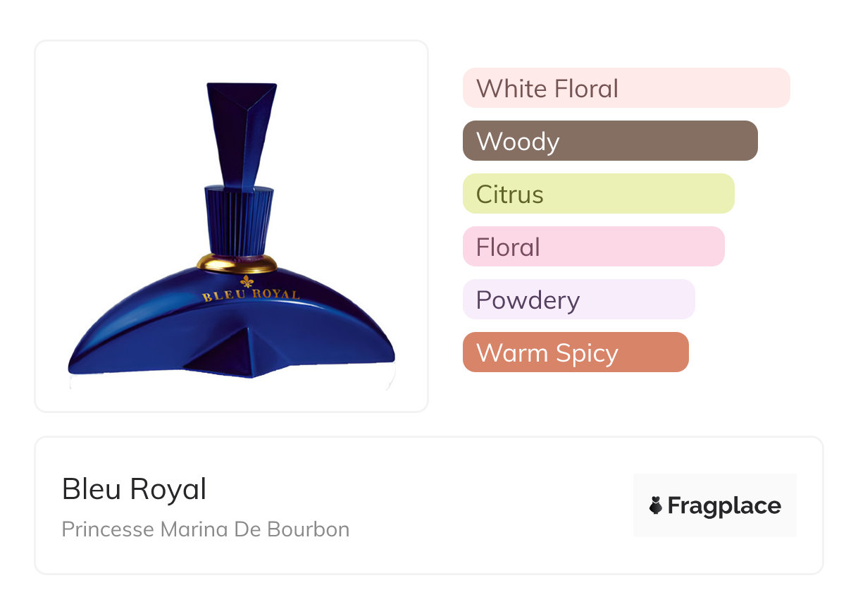 Bleu Royal, from Princesse Marina De Bourbon was released in 2012. The perfumer behind this creation is unknown. It has the top notes of Apple, Bergamot, and Orange Blossom, middle notes of Jasmine, Lotus, and Violet, and base notes of Amber, Patchouli, and Sandalwood.