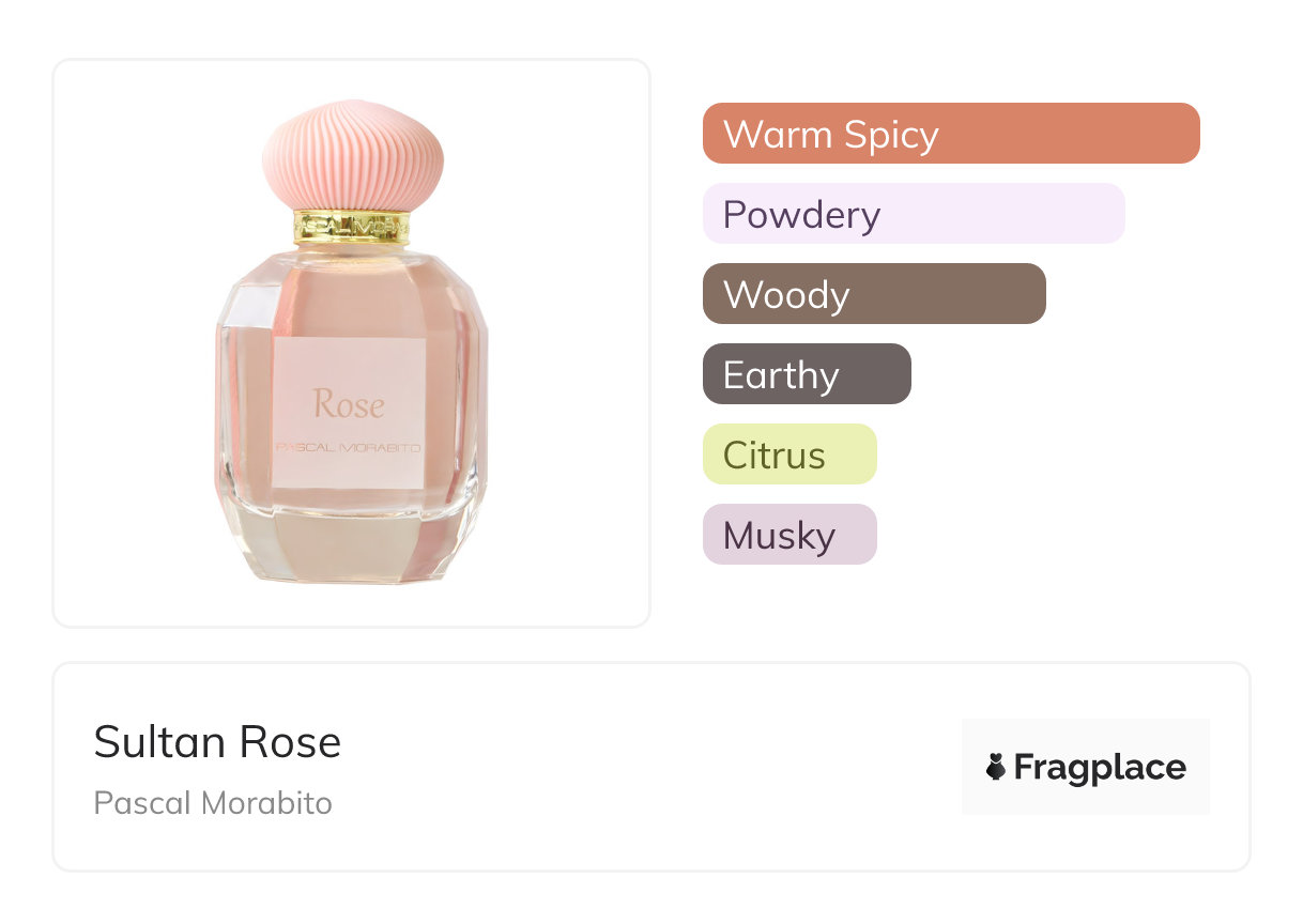 Sultan Rose, from Pascal Morabito was released at unknown year. The perfumer behind this creation is unknown. It has the top notes of Coffee and Tangerine, middle notes of Iris, Musk, Rose, and Saffron, and base notes of Amber, Patchouli, Sandalwood, and Vanilla.