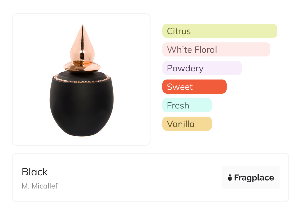 Black, from M. Micallef was released in 2011. The perfumer behind this creation is Jean-Claude Astier. It has the top notes of Bitter Orange, Lemon, and Plum, middle notes of Jasmine, Neroli, Tuberose, and Ylang-Ylang, and base notes of Benzoin, Musk, Powdery Notes, and Vanilla.