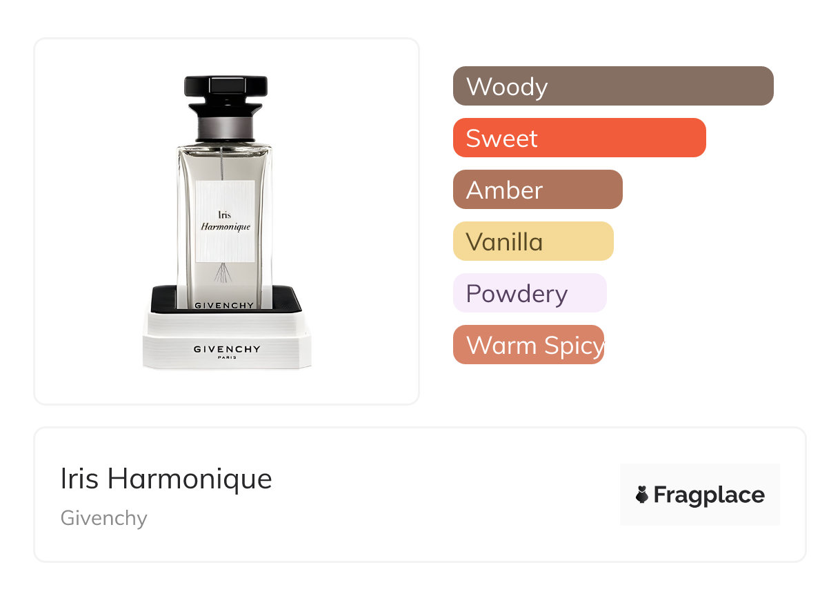 Iris Harmonique, from Givenchy was released in 2016. The perfumer behind this creation is unknown. It has the top notes of Angelica, Immortelle, Neroli, and Ylang-Ylang, middle notes of Amber, Coconut, Coumarin, Iris, and Leather, and base notes of Agarwood (Oud), Cedarwood, Guaiac Wood, Sandalwood, and Tonka Bean.