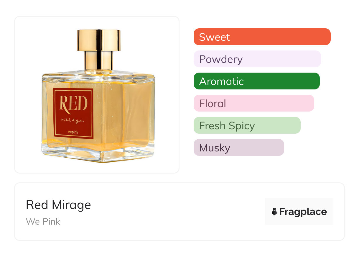 Red Mirage, from We Pink was released in 2024. The perfumer behind this creation is unknown. It has the top notes of Blood Orange, Marigold, and Saffron, middle notes of Jasmine, Lavender, and Violet, and base notes of Amber, Musk, Oakmoss, and Praline.
