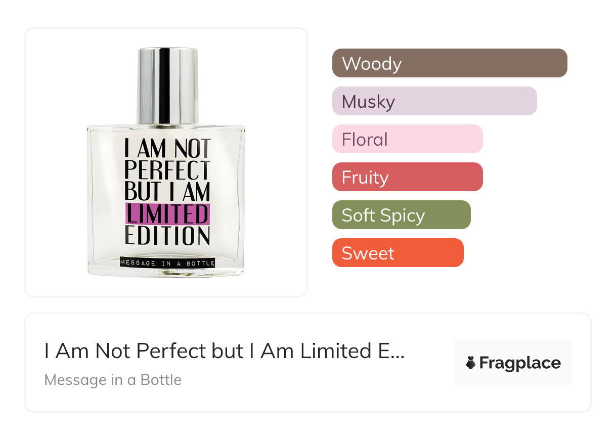 I Am Not Perfect but I Am Limited Edition, from Message in a Bottle was released in 2016. The perfumer behind this creation is unknown. It has the top notes of Black Currant, Papaya, and Peach Blossom, middle notes of Hazelnut, Jasmine, and Pink Pepper, and base notes of Labdanum, Musk, and Patchouli.