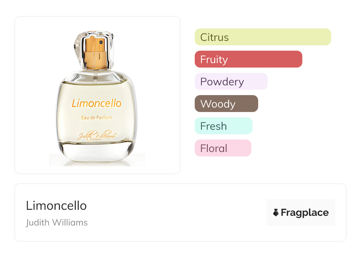 Limoncello, from Judith Williams was released at unknown year. The perfumer behind this creation is Pierre Bourdon. It has the top notes of Black Currant, Citruses, Lemon, and Orange, middle notes of Jasmine, Lychee, and Magnolia, and base notes of Cedarwood, Iris, Musk, and Peach.