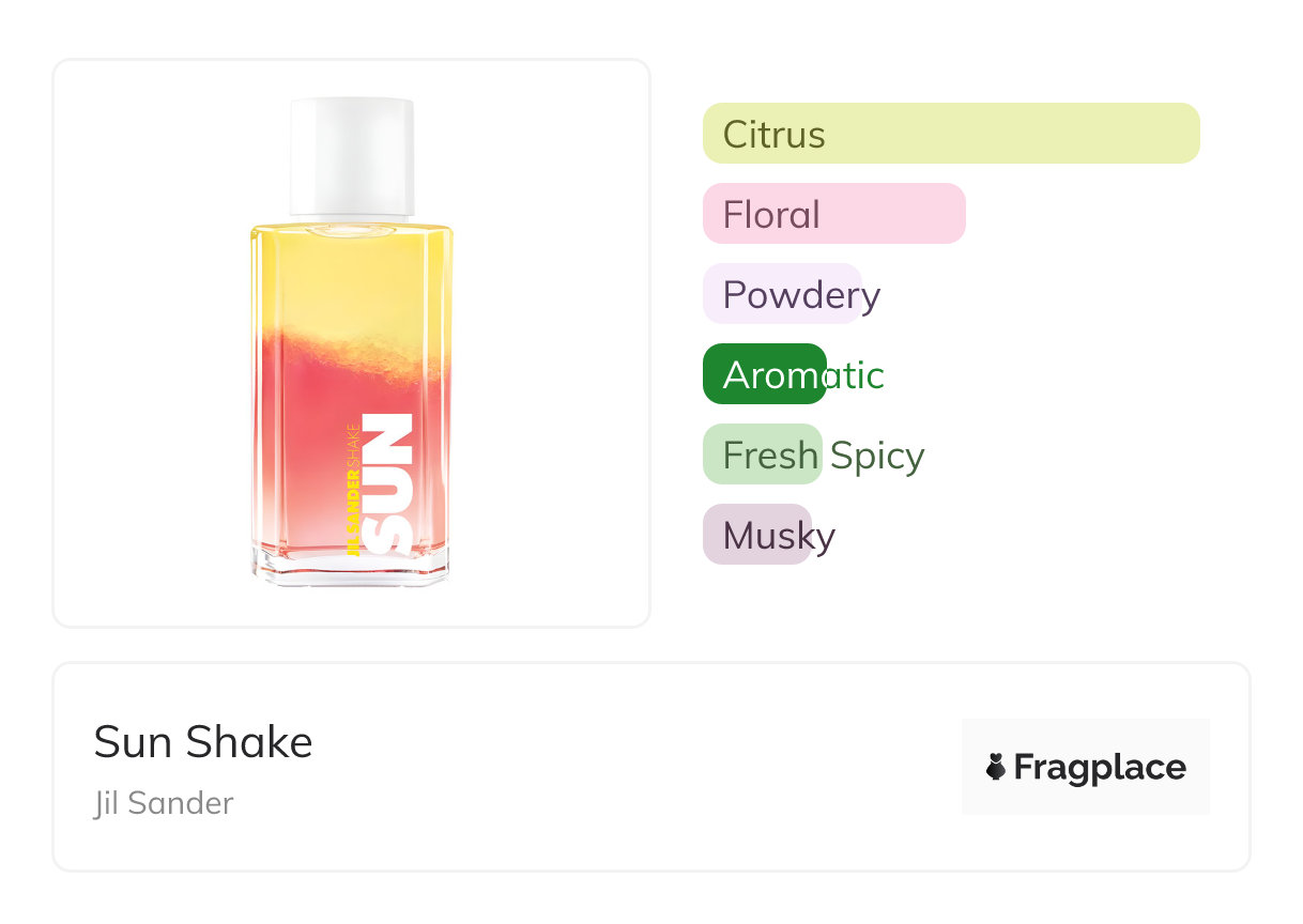 Sun Shake, from Jil Sander was released in 2016. The perfumer behind this creation is Nathalie Lorson. It has the top notes of Bergamot, Lemon, and Mandarin Orange, middle notes of Frangipani, Grapefruit, and Lotus, and base notes of Heliotrope, Musk, and Woody Notes.