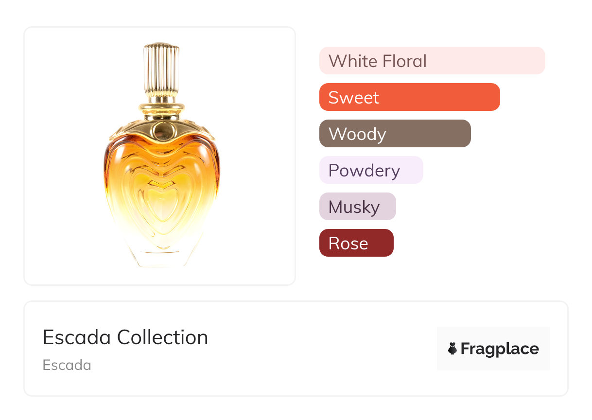 Escada Collection, from Escada was released in 1997. The perfumer behind this creation is Francoise Caron. It has the top notes of Caramel and Plum, middle notes of Jasmine, Orange Blossom, Rose, and White Flowers, and base notes of Cedarwood, Musk, Sandalwood, and Tonka Bean.