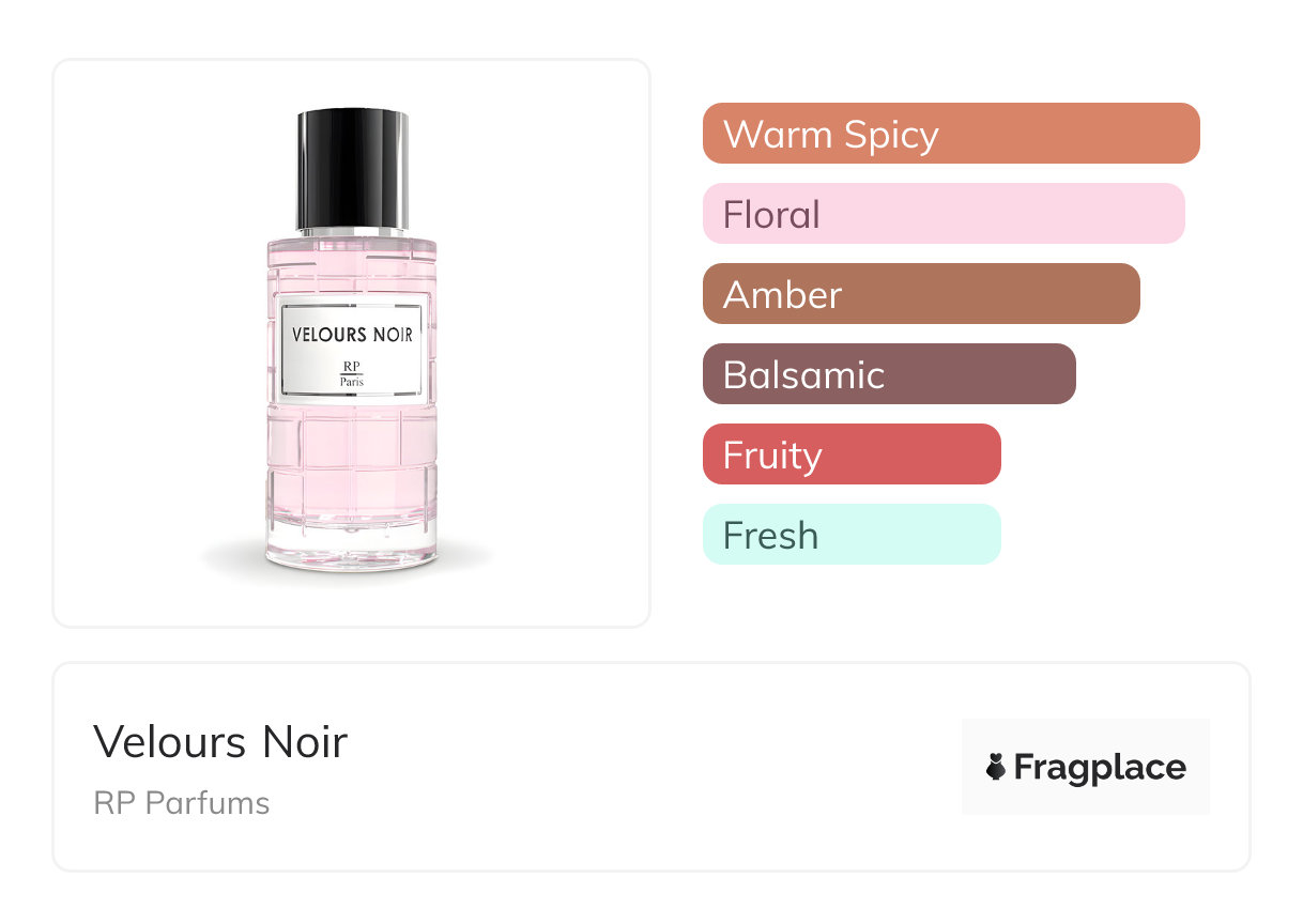 Velours Noir, from RP Parfums was released in 2024. The perfumer behind this creation is unknown. It has the top notes of Black Currant and Water, middle notes of Cyclamen, Jasmine, Narcissus, and Rose, and base notes of Agarwood (Oud), Benzoin, Incense, and Patchouli.