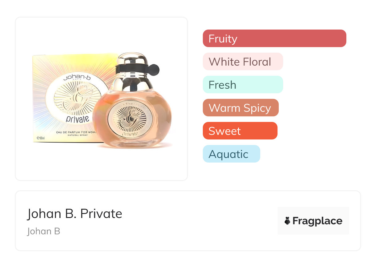 Johan B. Private, from Johan B was released in 2017. The perfumer behind this creation is unknown. It has the top notes of Black Currant, Dried Fruits, Melon, Red Apple, and Tangerine, middle notes of Cinnamon, Cloves, Jasmine, Lily-of-the-Valley, and Rose, and base notes of Musk, Oakmoss, and Sea Water.