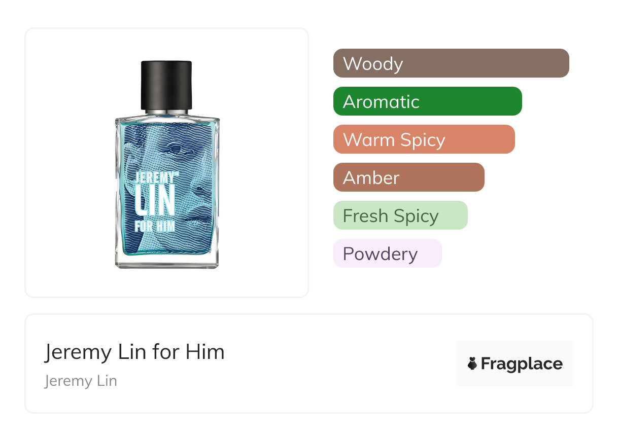 Jeremy Lin for Him, from Jeremy Lin was released in 2019. The perfumer behind this creation is unknown. It has the top notes of Cardamom, Mint, and Orange, middle notes of Cedarwood, Nutmeg, and Vetiver, and base notes of Amber, Incense, Musk, and Sandalwood.