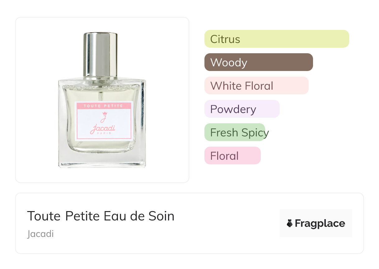 Toute Petite Eau de Soin, from Jacadi was released in 2015. The perfumer behind this creation is unknown. It has the top notes of Bergamot and Grapefruit, middle notes of Freesia, Lily-of-the-Valley, and Orange Blossom, and base notes of Cedarwood, Musk, and Sandalwood.