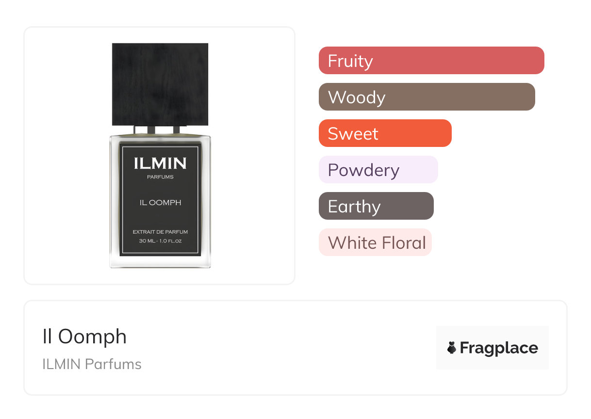 Il Oomph, from ILMIN Parfums was released in 2018. The perfumer behind this creation is unknown. It has the top notes of Apple, Pineapple, Plum, and Strawberry, middle notes of Arum Lily, Iris, Jasmine, and Rose, and base notes of Ambergris, Cedarwood, Cypriol Oil or Nagarmotha, Musk, Patchouli, and Sandalwood.