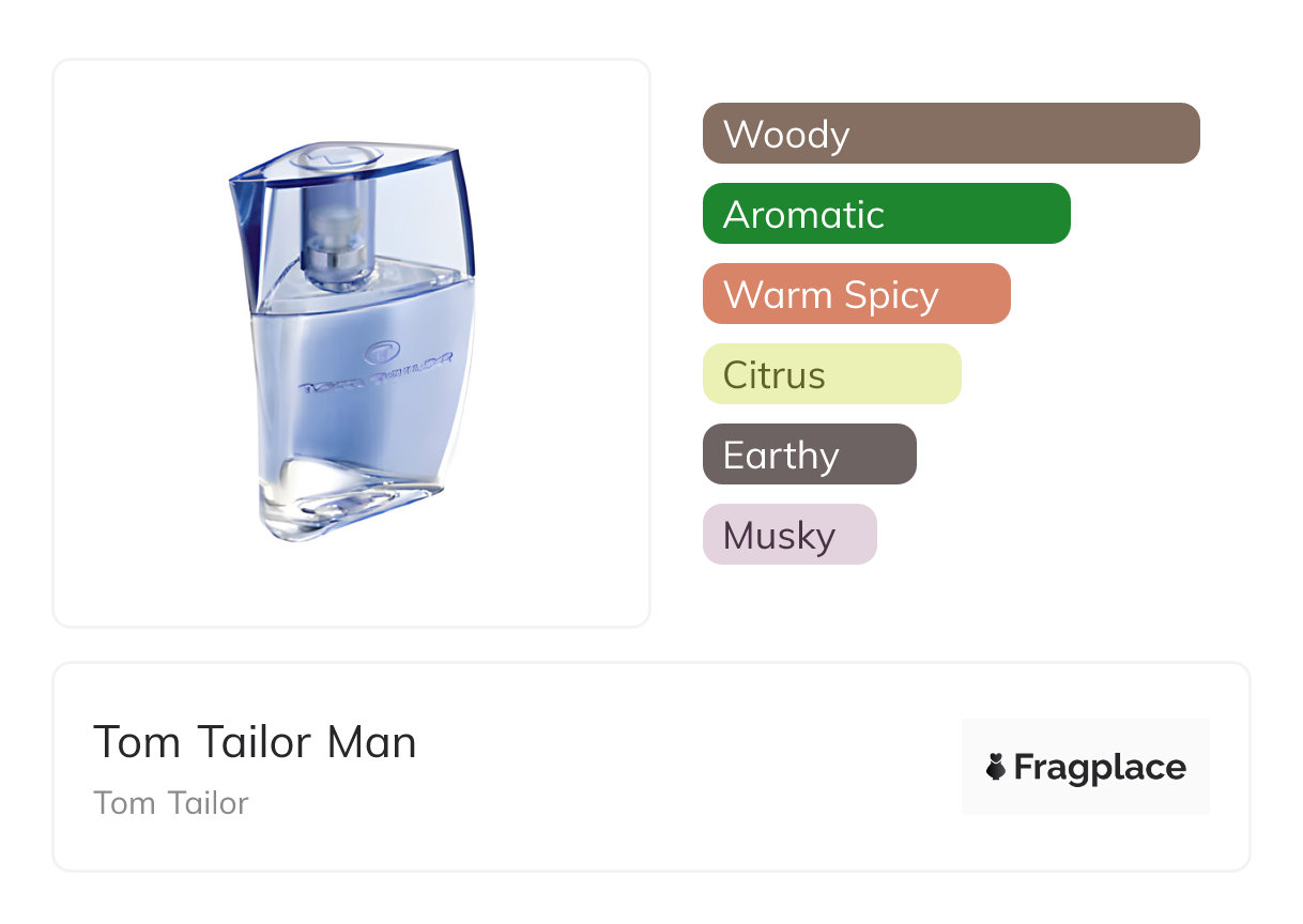 Tom Tailor Man, from Tom Tailor was released in 2011. The perfumer behind this creation is unknown. It has the top notes of Grapefruit and Orange Blossom, middle notes of Cardamom, Lavender, and Sage, and base notes of Cedarwood, Musk, Oakmoss, Palisander Rosewood, and Patchouli.