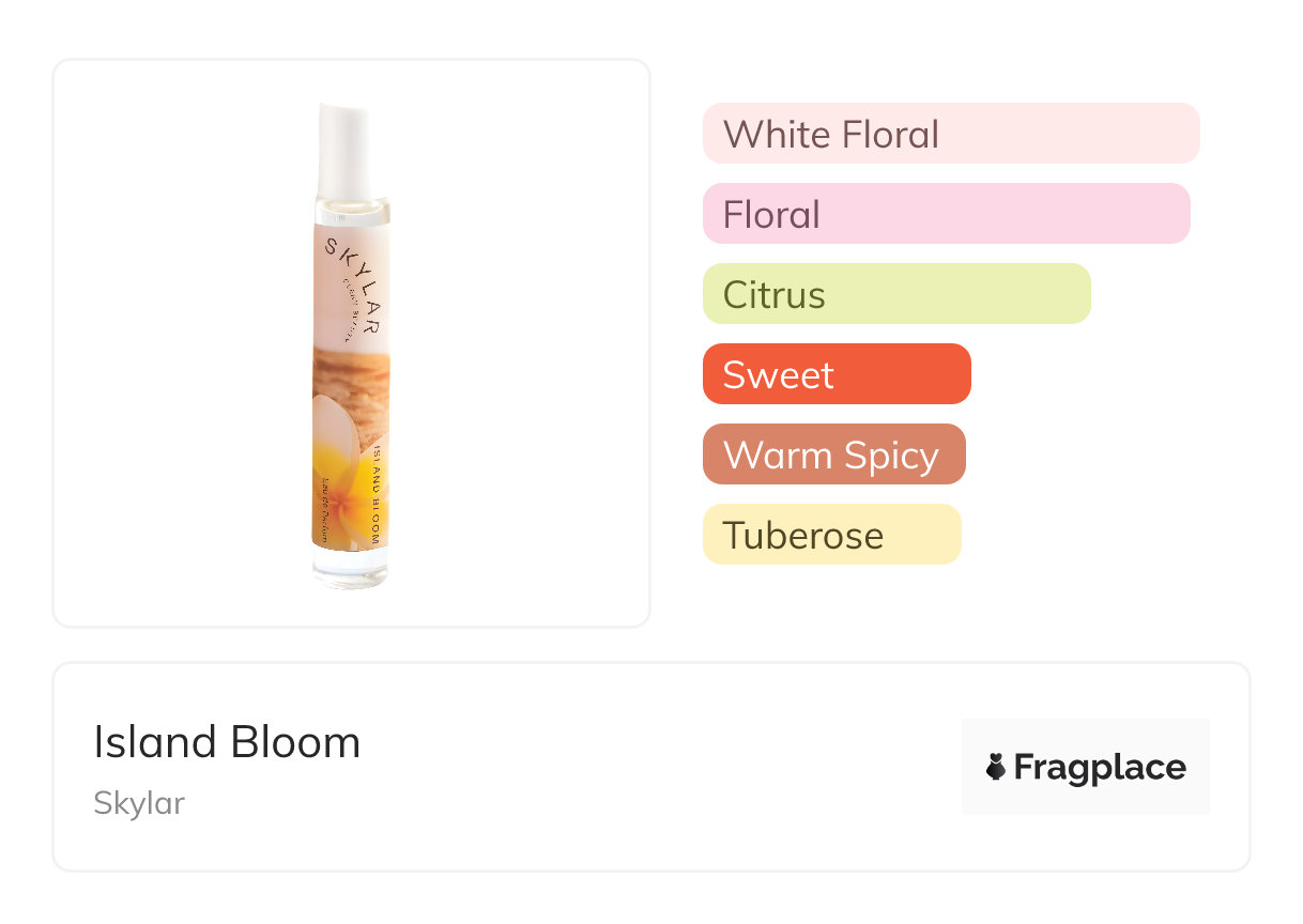 Island Bloom, from Skylar was released in 2023. The perfumer behind this creation is unknown. It has the top notes of Cardamom, Coconut Water, and Orange, middle notes of Frangipani, Jasmine, and Tuberose, and base notes of Amber, Cedarwood, and Orchid.
