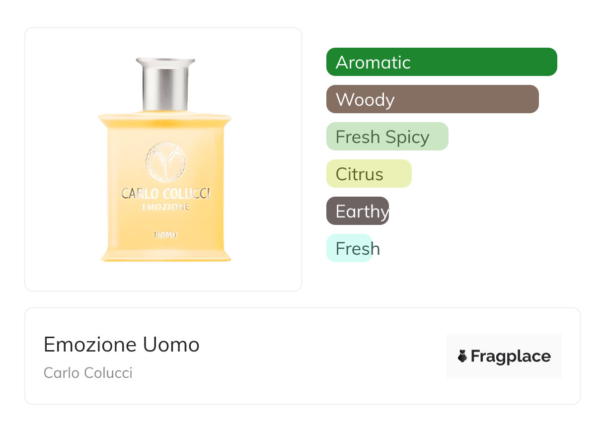 Emozione Uomo, from Carlo Colucci was released in 2008. The perfumer behind this creation is unknown. It has the top notes of Bergamot, Hazelnut, and Lemon, middle notes of Coriander, Cypress, and Juniper, and base notes of Fir, Leather, Patchouli, and Vetiver.