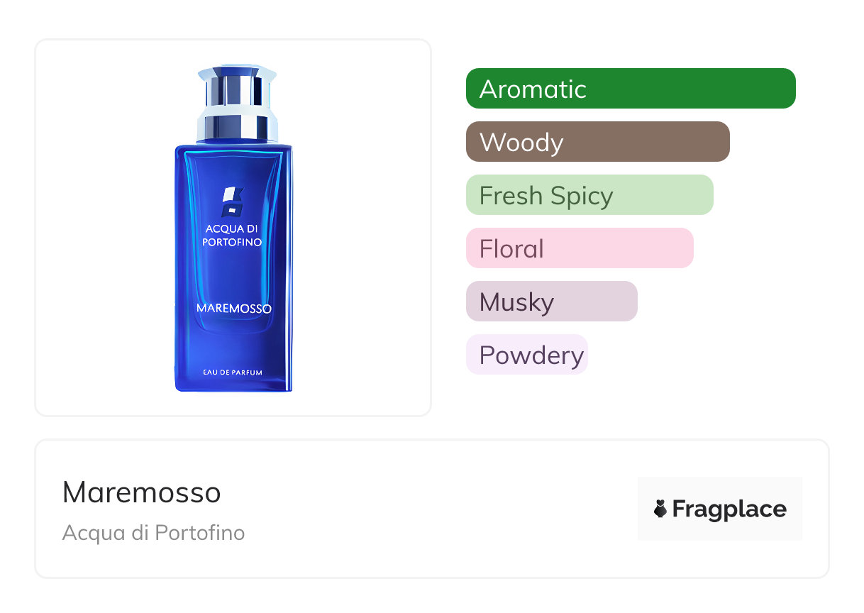 Maremosso, from Acqua di Portofino was released in 2024. The perfumer behind this creation is unknown. It has the top notes of Black Currant, Grapefruit, Rosemary, and Sea Water, middle notes of Basil, Lavender, Rose, and Water Lily, and base notes of Ambrette (Musk Mallow), Cedarwood, Musk, and Sandalwood.