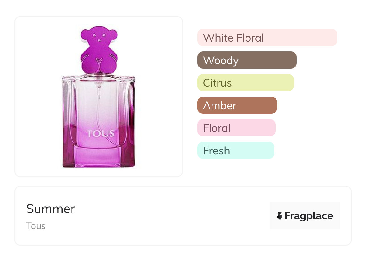 Summer, from Tous was released in 2006. The perfumer behind this creation is unknown. It has the top notes of Bergamot, Black Currant, and Mandarin Orange, middle notes of Gardenia, Jasmine, Lily-of-the-Valley, Peony, Pepper, and Ylang-Ylang, and base notes of Amber, Cedarwood, Musk, and Tonka Bean.