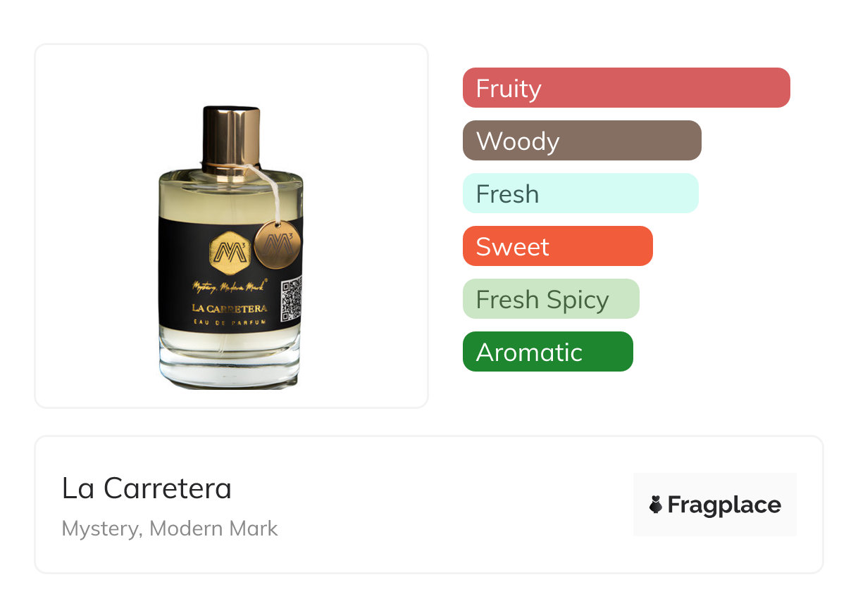 La Carretera, from Mystery, Modern Mark was released in 2021. The perfumer behind this creation is Claudine Roublot. It has the top notes of Apple, Bergamot, Black Currant, and Pineapple, middle notes of Fir, Jasmine, Patchouli, and Rose, and base notes of Ambergris, Musk, and Vanilla.