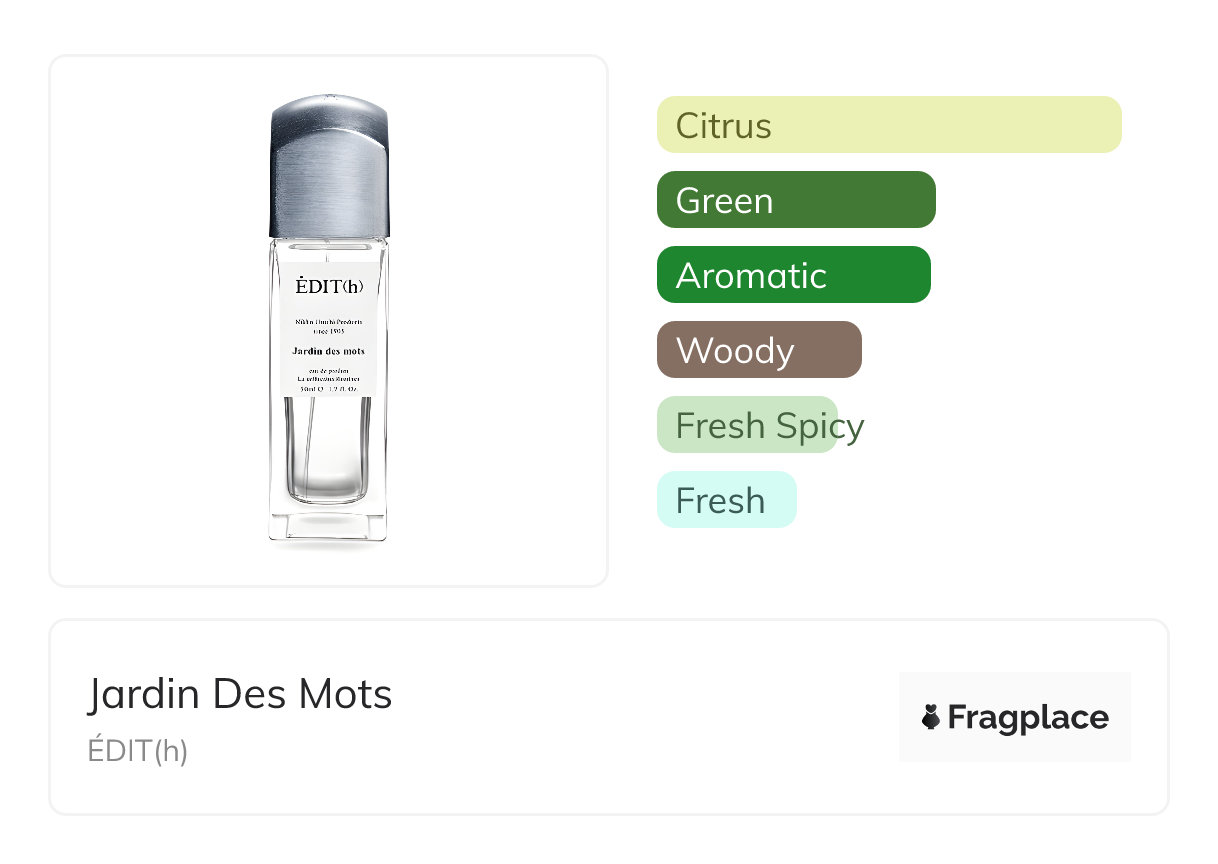 Jardin Des Mots, from ÉDIT(h) was released in 2021. The perfumer behind this creation is Alexandra Carlin. It has the top notes of Bergamot, Galbanum, Ginger, Mandarin Orange, and Petitgrain, middle notes of Bergamot, Lily-of-the-Valley, and Rose, and base notes of Cedarwood, Musk, and Oakmoss.