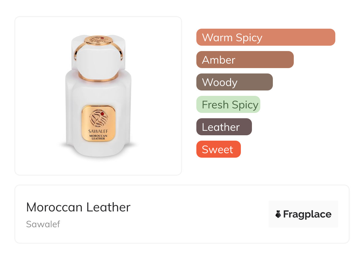 Moroccan Leather, from Sawalef was released in 2023. The perfumer behind this creation is unknown. It has the top notes of Cardamom, Cloves, Nutmeg, Raspberry, and Saffron, middle notes of Olibanum (Frankincense), Orange Blossom, Rose, and Violet, and base notes of Agarwood (Oud), Amber, Cedarwood, Labdanum, Leather, and Patchouli.