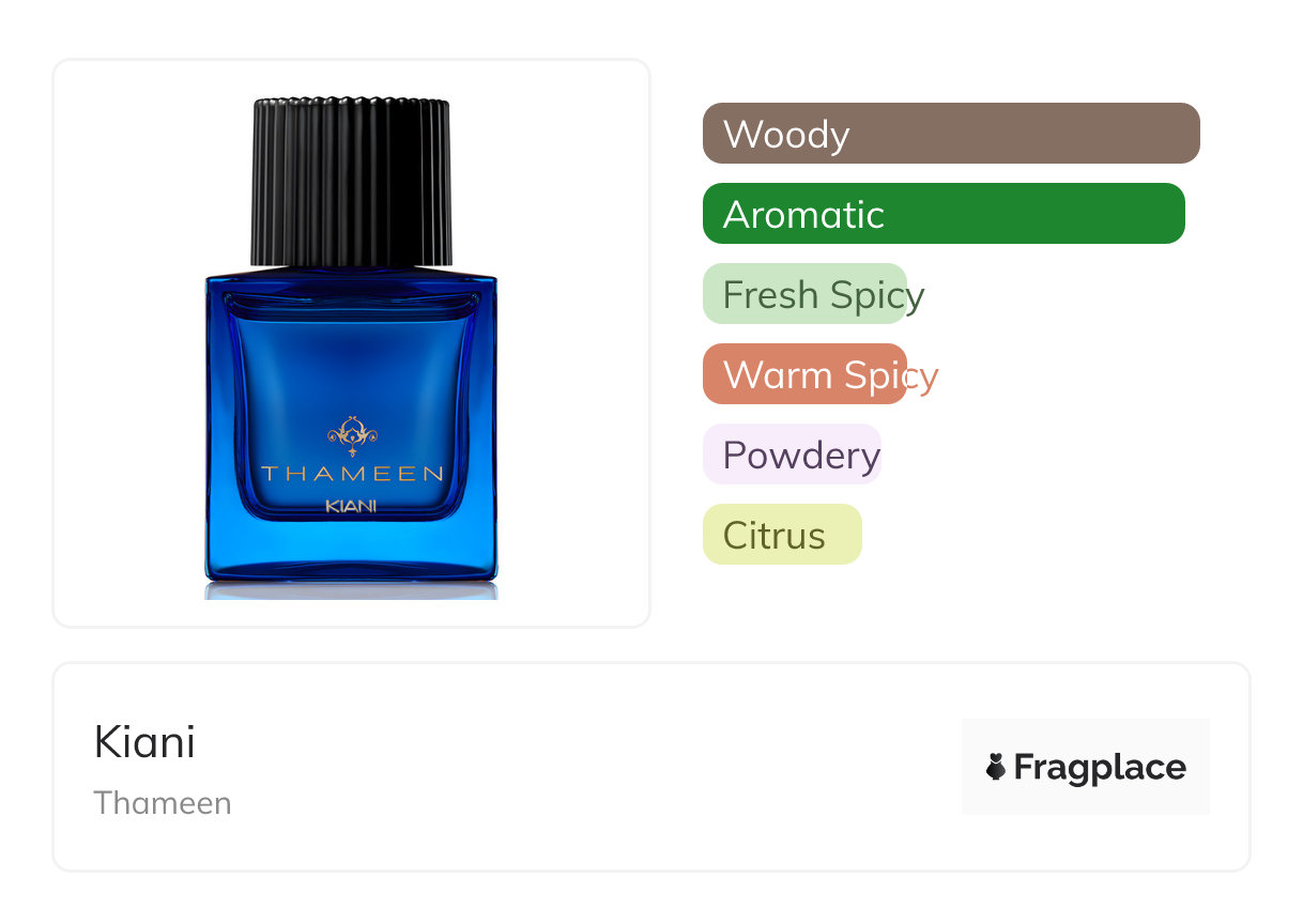 Kiani, from Thameen was released in 2017. The perfumer behind this creation is Alexandre Illan. It has the top notes of Citron, Elemi, Green Pepper, and Sage, middle notes of Cumin, Ginger, and Lavender, and base notes of Cedarwood, Guaiac Wood, Musk, Sandalwood, and Vetiver.