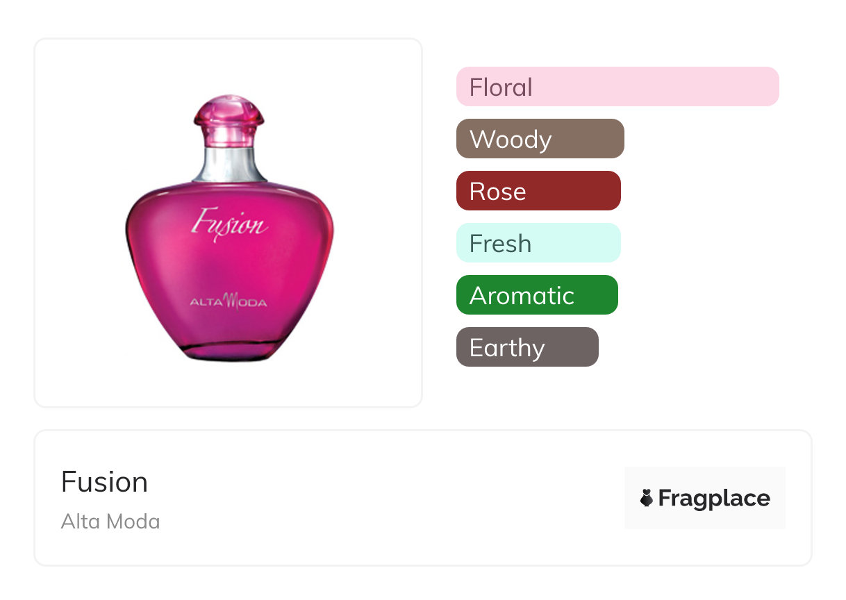 Fusion, from Alta Moda was released at unknown year. The perfumer behind this creation is unknown. It has the top notes of Lemon, Lychee, and Peony, middle notes of Freesia, Pink Pepper, and Rose, and base notes of Ambrette (Musk Mallow), Patchouli, and Vetiver.