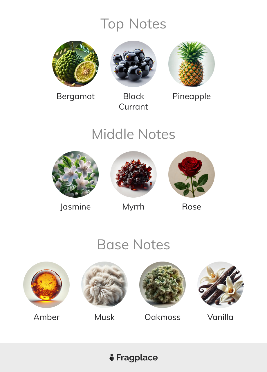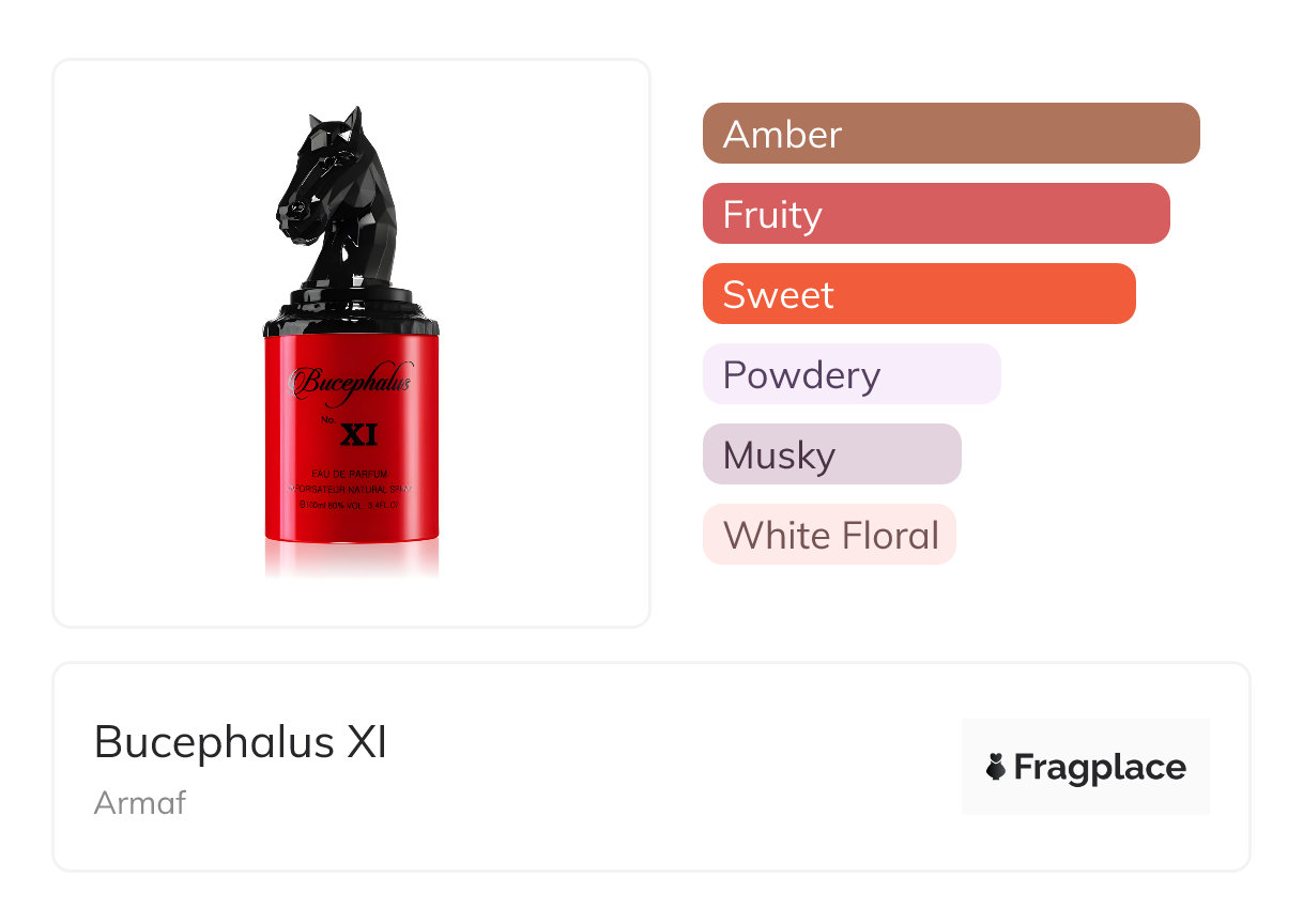 Bucephalus XI, from Armaf was released at unknown year. The perfumer behind this creation is unknown. It has the top notes of Bergamot, Black Currant, and Pineapple, middle notes of Jasmine, Myrrh, and Rose, and base notes of Amber, Musk, Oakmoss, and Vanilla.