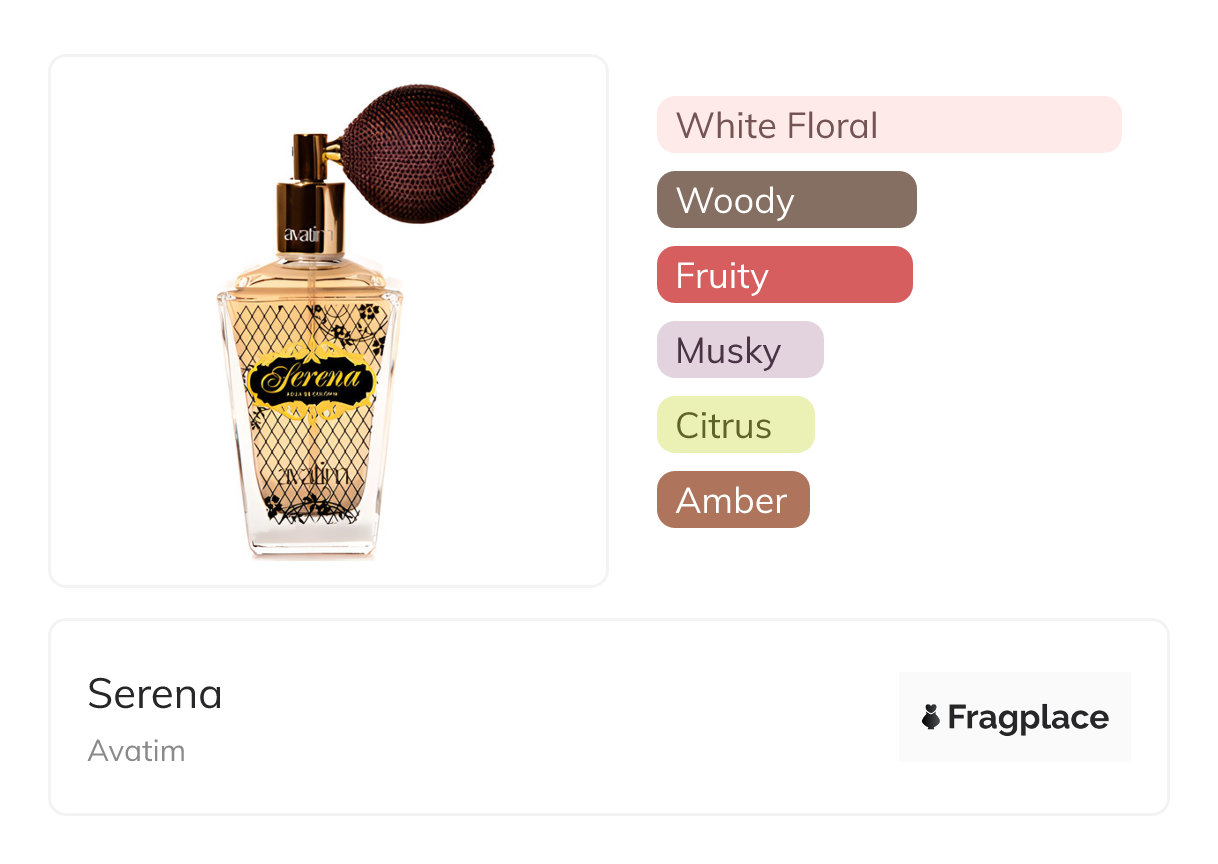 Serena, from Avatim was released in 2012. The perfumer behind this creation is Roberth Sertório. It has the top notes of Forest Fruits, Gardenia, and Mandarin Orange, middle notes of Honeysuckle, Jasmine, and Woody Notes, and base notes of Amber, Musk, and Praline.
