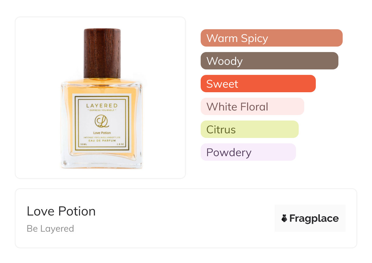 Love Potion, from Be Layered was released in 2019. The perfumer behind this creation is unknown. The notes are Almond, Amber, Bergamot, Cacao Pod, Cashmere wood, Cedarwood, Cinnamon, Coffee, Jasmine, Lemon, Musk, Orange Blossom, Orris Root, Patchouli, Praline, Rose, Sandalwood, Tonka Bean, Tuberose, Vanilla.