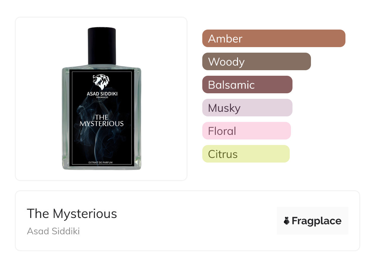 The Mysterious, from Asad Siddiki was released in 2024. The perfumer behind this creation is Asad Ali Siddiki. It has the top notes of Citruses and Spicy Notes, middle notes of Floral Notes, Fruity Notes, and Green Notes, and base notes of Ambergris, Earthy Notes, Musk, Resins, and Woody Notes.