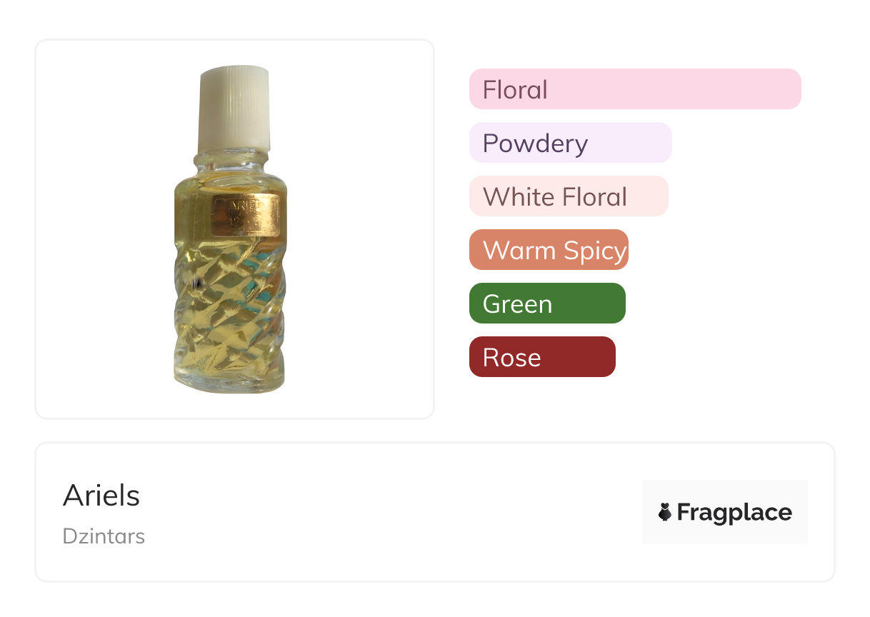 Ariels, from Dzintars was released in 1993. The perfumer behind this creation is unknown. It has the top notes of Black Currant, Lily-of-the-Valley, and Violet, middle notes of Carnation, Hyacinth, Jasmine, and Rose, and base notes of Amber, Musk, and Sandalwood.